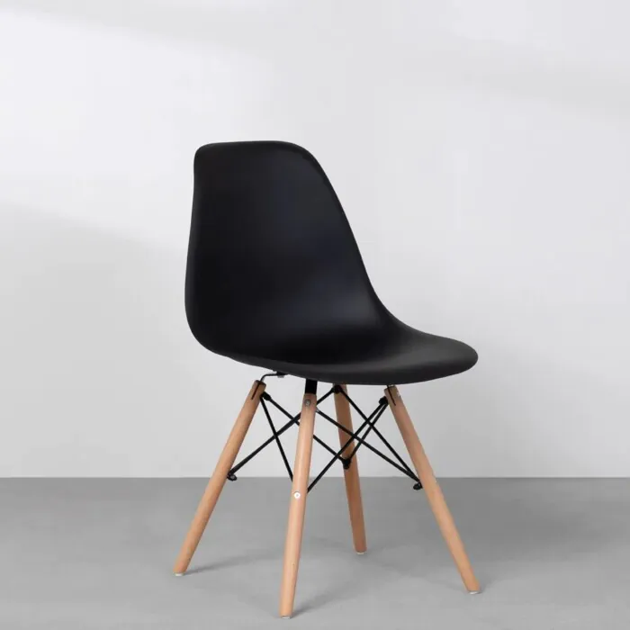 –Com 04 Cadeiras Eiffel Pretos: Seu assento é produzido em polipropileno, vale ressaltar que o encosto e o assento são unidos formando uma curva perfeita que se adapta ao corpo, como resultado obtém-se uma cadeira superconfortável.