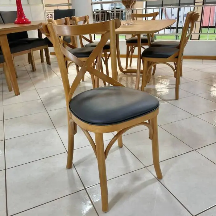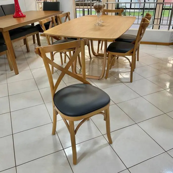 – Com 06 Cadeiras em Madeira Tauari Leon X, o assento é Estofado revestido de Tecido Facto IMPERMEÁVEL cor Preto