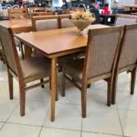 – Com 06 Cadeiras Karol em Madeira estofada, em tecido Linho