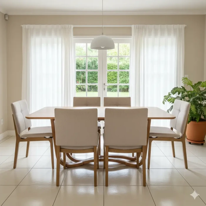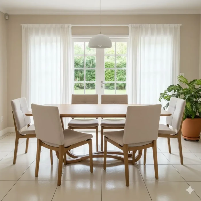 – Com 6 Cadeira Hill ergonômicas em Madeira. Design moderno com detalhe de costura botone e tecido Linho Nobre.