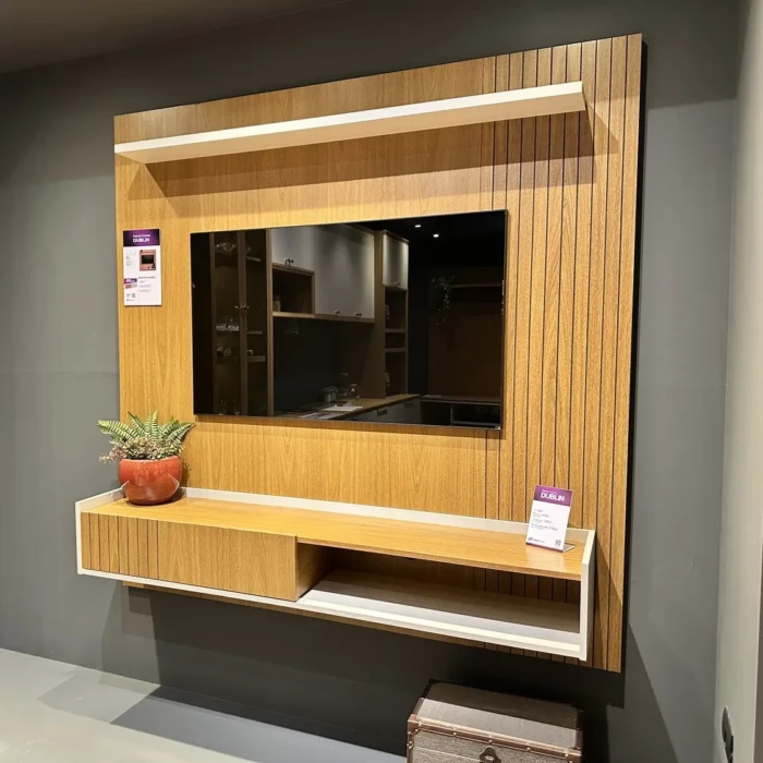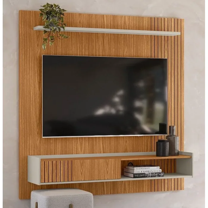 Lindo Painel em tom madeirado com off white com delicado detalhe ripado