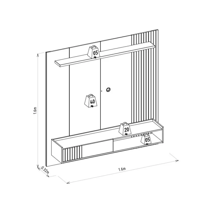 Possui uma porta basculante e suporta TV de até 65′ polegadas