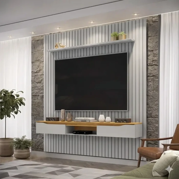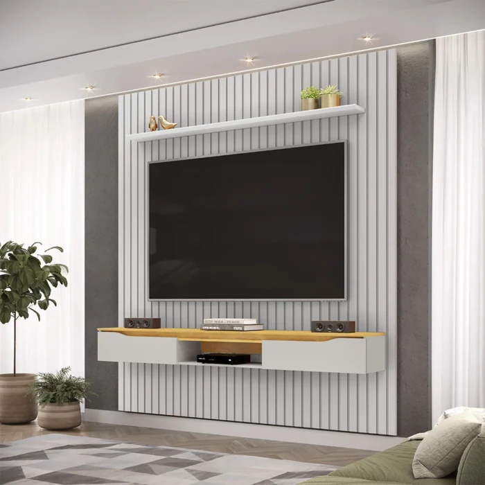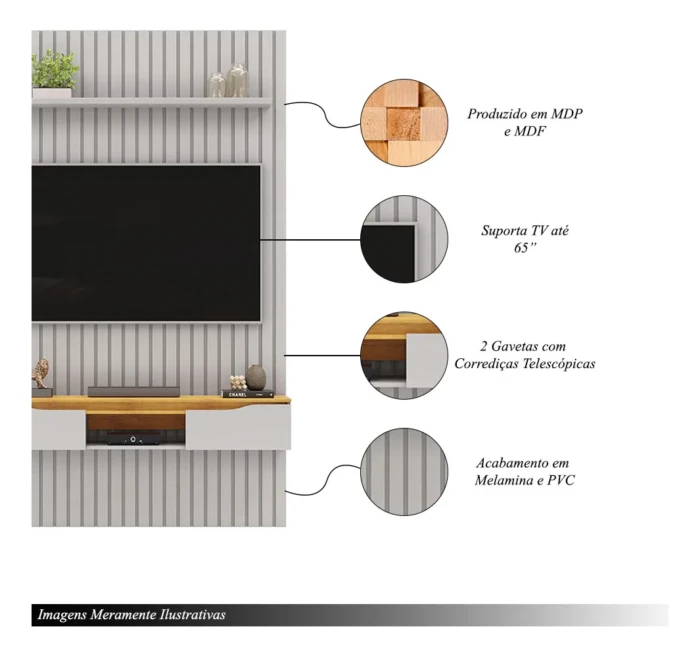 Projetado para suportar televisores de até 65 polegadas, o painel oferece estrutura estável e segura, sendo uma excelente escolha para compor espaços compactos ou ambientes que pedem soluções inteligentes de aproveitamento.