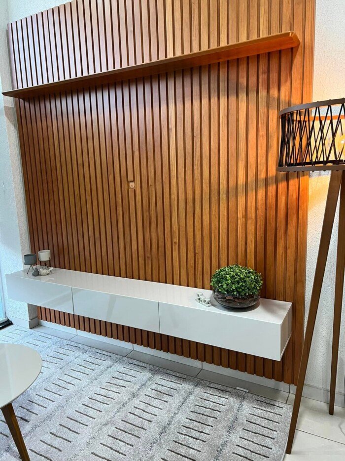 Com uma composição de cores moderna no ripado madeirado com off white,