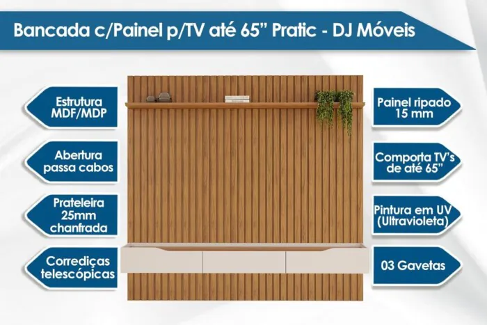 Composto de Painel e Bancada com 3 Gavetas com frente usinada e corrediça telescópica, super charmoso.
