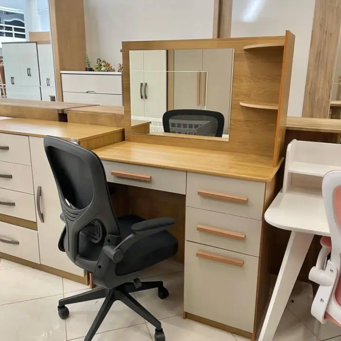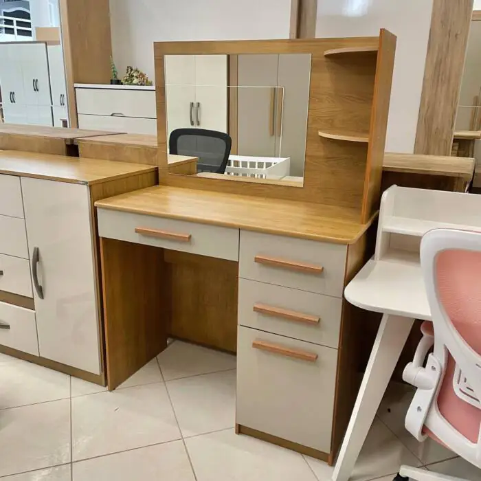 A Penteadeira Pérola COM Espelho é muito charmosa e prática, pois possui espelho, três gavetas e 01 porta, que facilitam a organização de seus objetos.