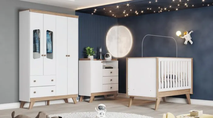 Lançamento da Coleção, com pés retro e uma linda composição de cores madeirado com branco, para um quarto de nenê modermo.