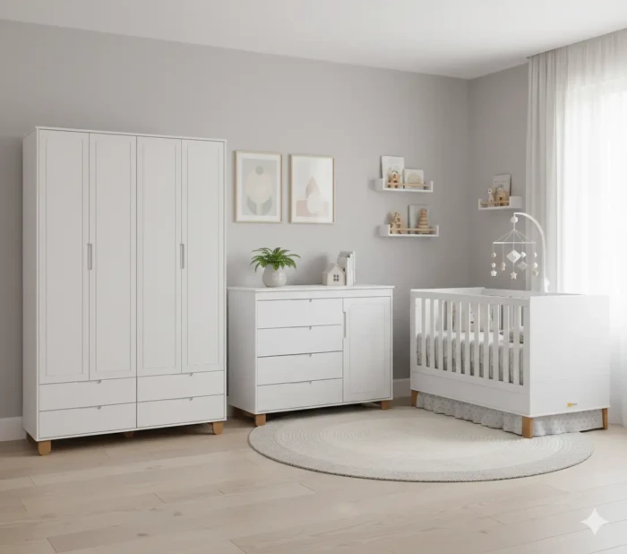 Um Lindo e Moderno Quarto de Bebê 100% MDF composto de 3 peças: Roupeiro, Cômoda e Berço.