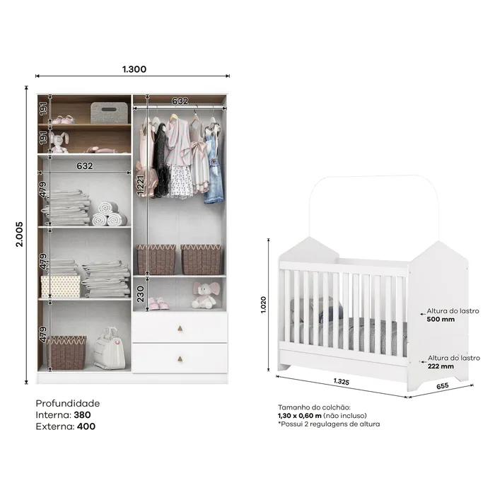 Composto por 3 Peças: Roupeiro + Comoda + Berço