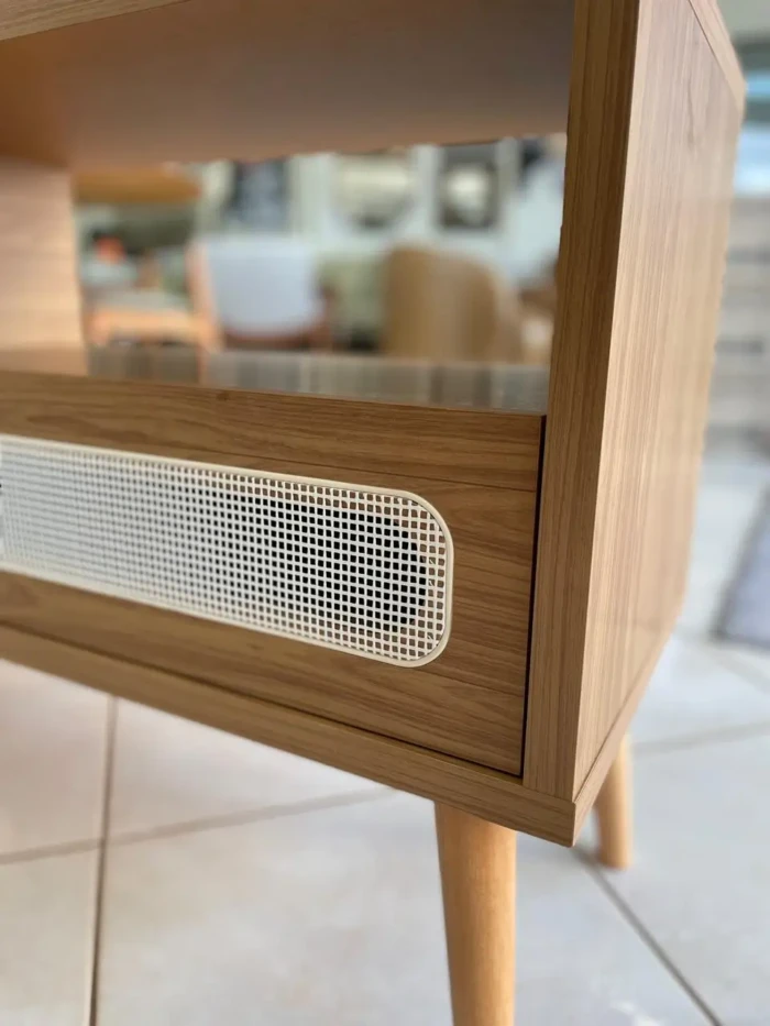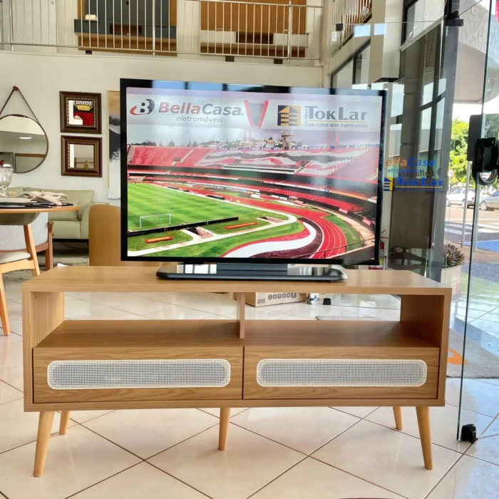 Com detalhes em palha que conferem um toque rústico e charmoso, este rack é um verdadeiro destaque na decoração do ambiente.
