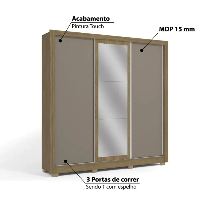 Roupeiro 2,23m 3 Portas Deslizantes com Espelho PM570 (3149)