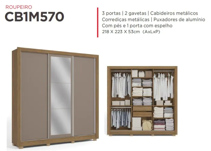 Imponente e bonito, em sua versão com espelhos e pés,o Roupeiro PM569 possui 03 Deslizantes e ótima divisão interna