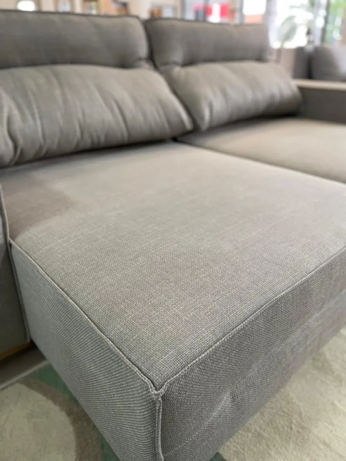 Para uma Sala com Requinte e Sofisticação, a base em Madeira Nobre num sofá Retrátil é o seu diferencial. Em tecido linho