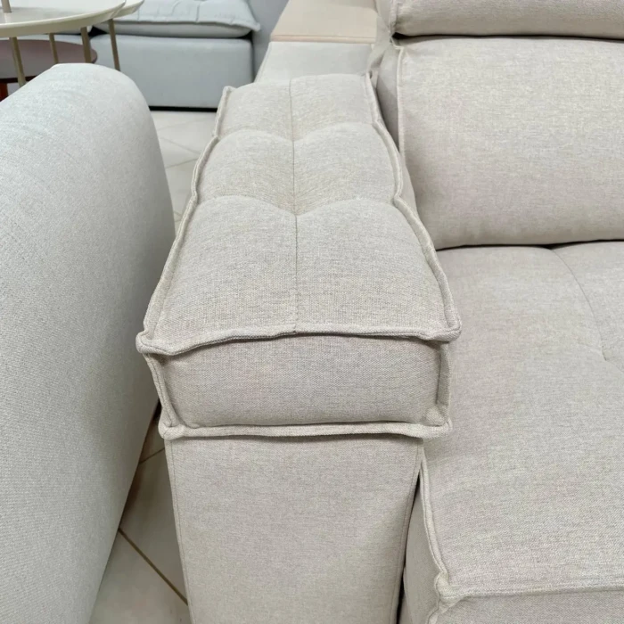 Em seu tecido linho bege com toque macio: aconchegante, fácil para limpar e elegante para sua sala