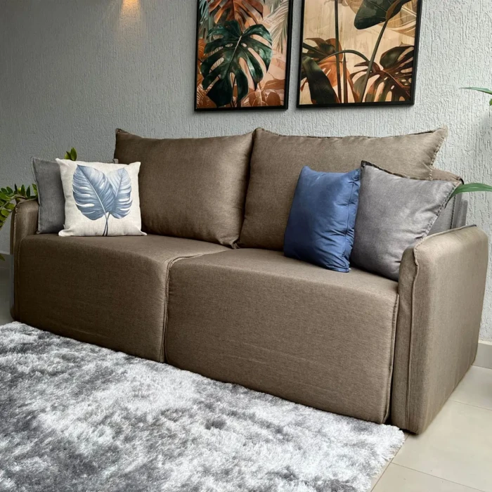 Em maravilhoso tecido Linho marrom, com almofadas soltas.