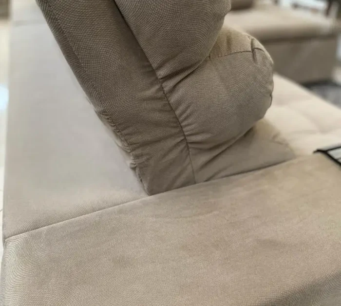 Em Tecido Suedi Bege texturizado, com leve alto relevo, toque macio